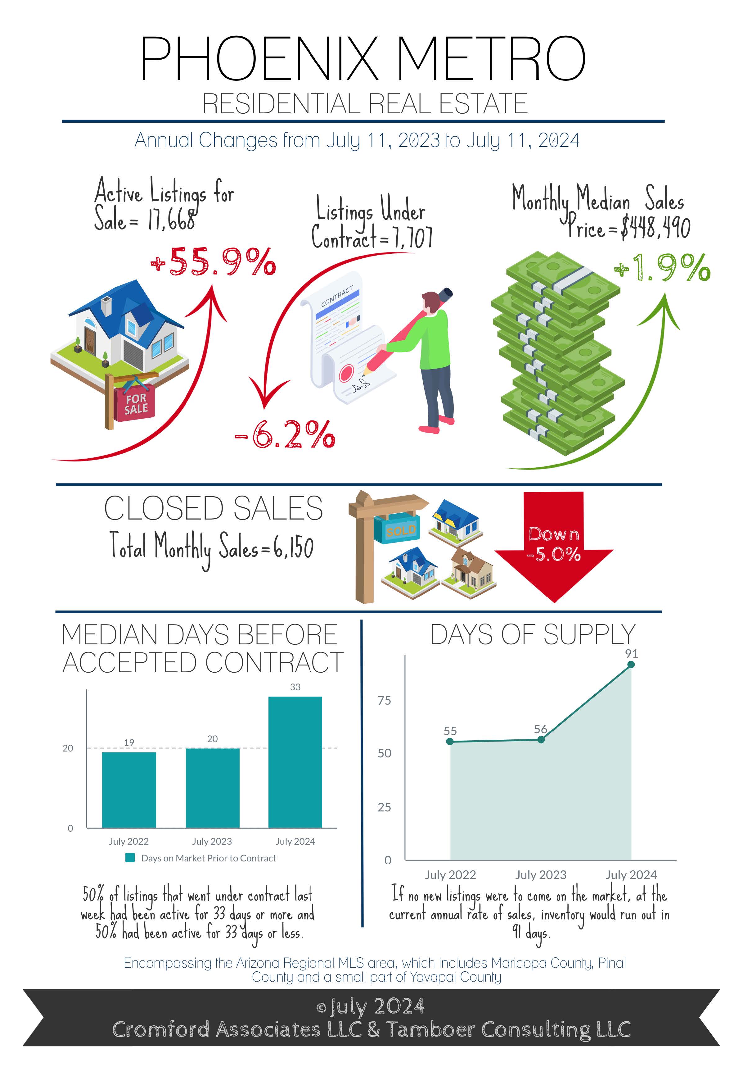 There are 9 cities in buyer’s markets in Greater Phoenix as of July, located primarily in the West Valley and Pinal County. These areas have significant levels of new construction. These growing communities increase competing supply as builders create shiny new inventory for buyers to consider. Single family permits are up 56% to-date compared to last year, reflecting a strong optimism here that isn’t reflected in other parts of the country. As the second lowest count of new resale listings hit the market, new construction has little competition and comprises 27% of all single-family home sales in the first half of 2024. New builds are formidable competitors for resale sellers.